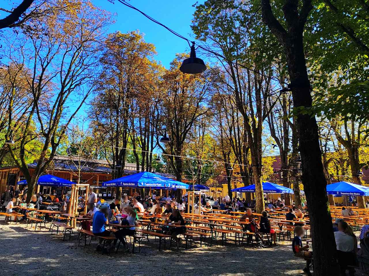 Unter den großen Kastanienbäumen gibt es rund 1200 Sitzplätze mit traditionellen Biertischen und -bänken.