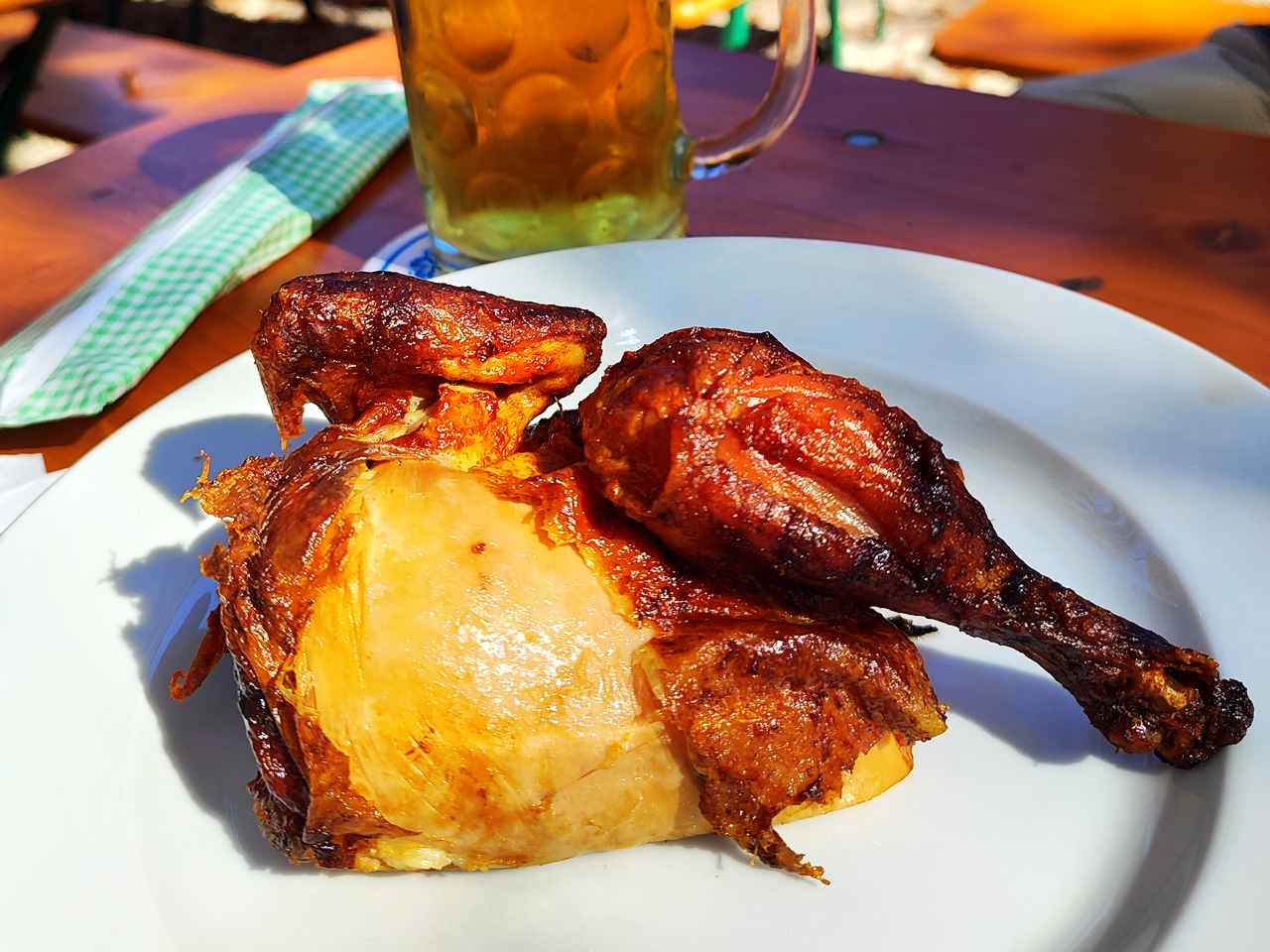 Zum Essen hatte ich mein Lieblingsgericht: ein gegrilltes halbes Hähnchen. Ich war damit zufrieden. Es war zart und hat lecker geschmeckt. Stephan aß Currywurst mit Pommes.