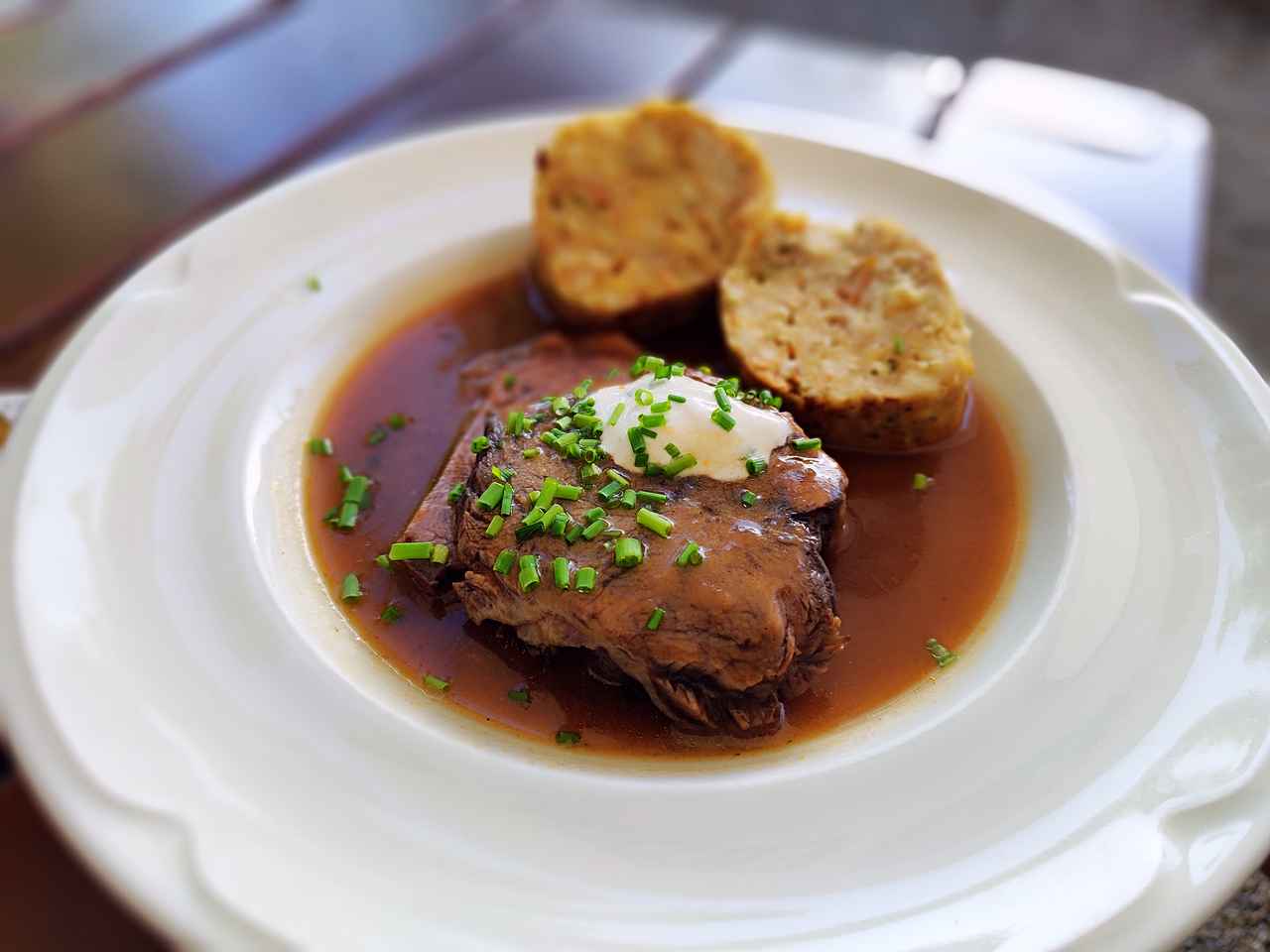 Auf der umfangreichen Speisekarte sollte für jeden etwas zu finden sein. Die Preise sind für das Angebot angemessen. Sopha wählte das Rahmgeschnetzelte mit Pilzen und Spätzle. Ich entschied mich für den Sauerbraten mit Knödeln.